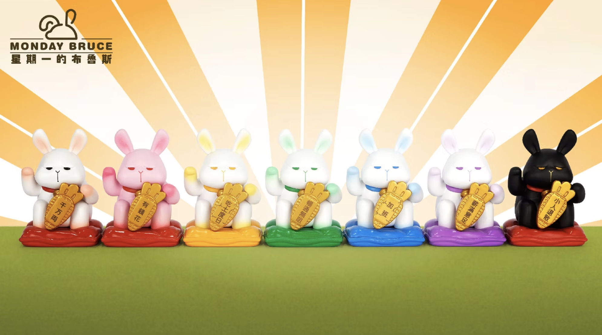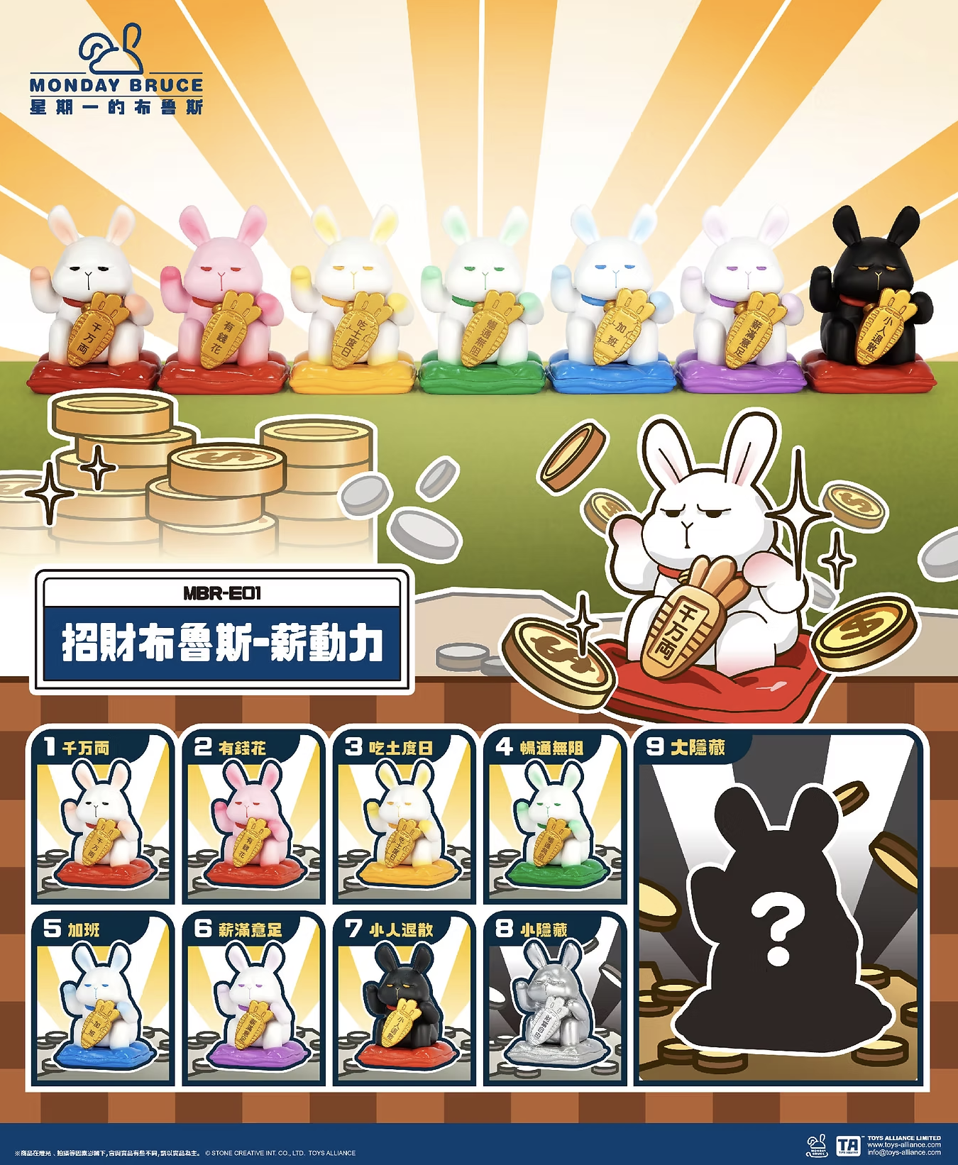 7 regular designs + 2 mystery secret editions — each Bruce brings a unique blessing for wealth, success, or just surviving the workweek.