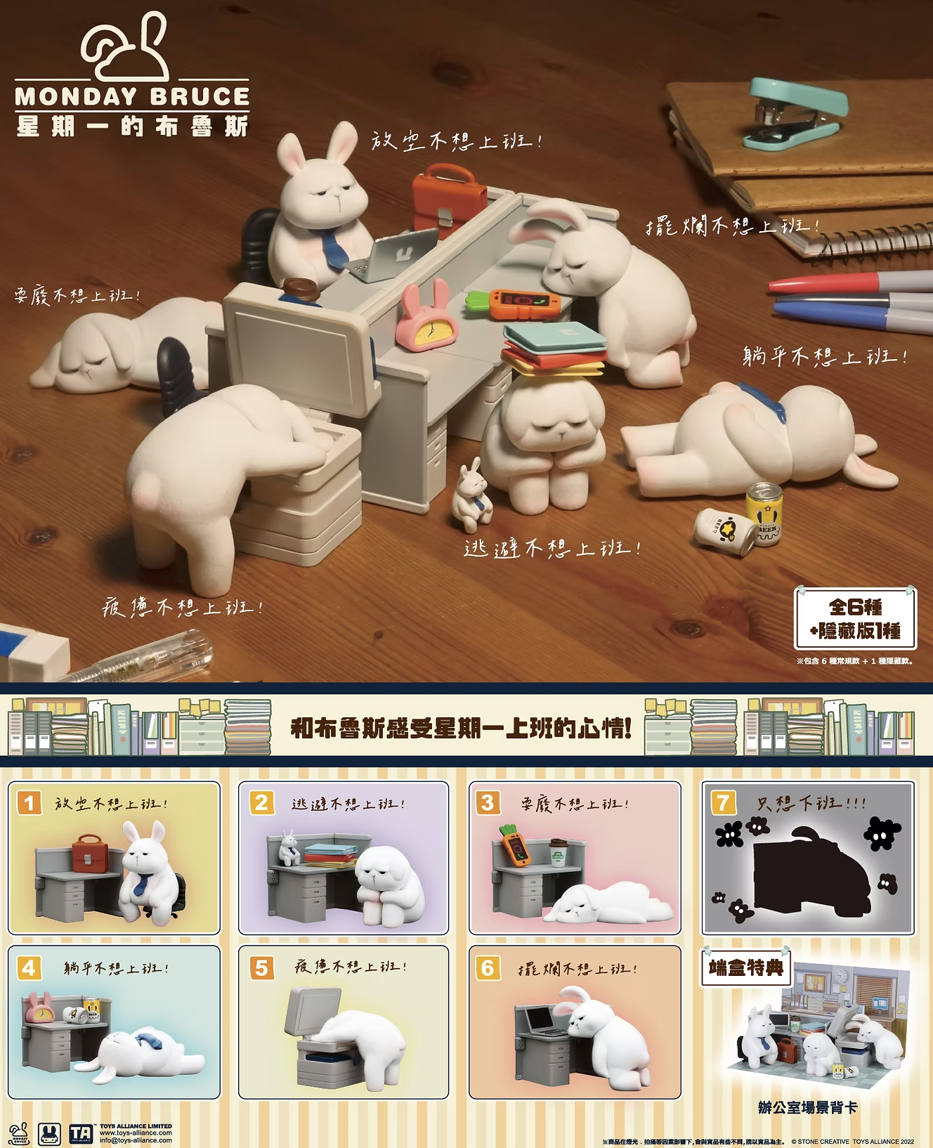We all have Monday blues, and so is Bruce, from his face and actions, you will know that he really doesn’t want to work today.Each set has a Bruce (flocking), a work desk or a business machine, and other accessories